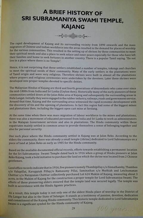 “The Temple is the oldest established Hindu Temple in Kajang which has witnessed the development of Kajang Town from a rural settlement to a modern suburban township.” (Lee Kim Sin, 16 Januari 2016: "Sri Subramaniya Swamy Temple Kajang is celebrating its Centennial Anniversary this year (1916-2016)").