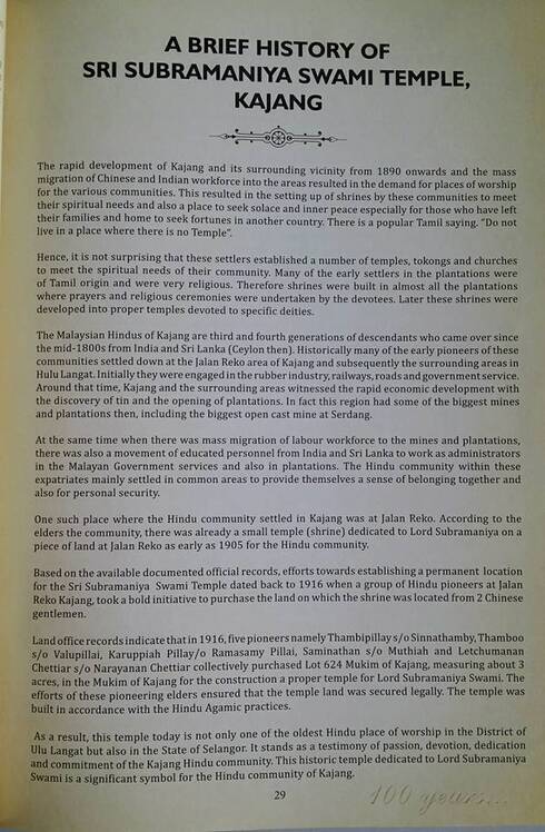 “The Temple is the oldest established Hindu Temple in Kajang which has witnessed the development of Kajang Town from a rural settlement to a modern suburban township.” (Lee Kim Sin, 16 Januari 2016: "Sri Subramaniya Swamy Temple Kajang is celebrating its Centennial Anniversary this year (1916-2016)").