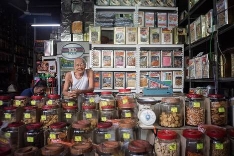“More than fifty huge glass jars with red lids, and metal tins neatly arranged on metal shelves, from low to high, layer by layer, containing a wide variety of traditional biscuits and snacks, in a dazzling array of nearly a hundred flavours. Kwong Sang Woh, located in Kajang's old town, has been in business since 1907, staying in the same address for over a century, retaining the brick arcade architecture. 87-year-old Siew Pak Chong is the second generation owner, still quick-witted and alert despite his old age. He is a fixture at the shop counter, where he collects payments or chit-chat with his friends. Originally a grocery store, Kwong Sang Woh mainly sells daily supplies, and also a few biscuits. Since his son Siew Zi Kin (transliteration) and daughter-in-law Tan Bee Kien took over the reins, the shop gradually underwent a series of changes to specialize in selling traditional biscuits, their means of surviving business hardships faced by traditional grocery stores. Their customer base has also expanded outside ethnic Chinese to include other races such as Malays and Indians, and they are always busy. The golden era of grocery stores dated back in the 1950’s and 60’s, where you could find one almost everywhere, be it hustling streets or remote villages. Besides providing day-to-day goods, grocery stores also function as a uniting spot for the community to exchange information and build relationships. With the rapid economic growth and changes in the consumer market, dawns the elimination of traditional grocery stores. Chain hypermarkets, supermarkets, and mini marts spring up in residential neighbourhoods like mushrooms after the rain, dealing a heavy blow to traditional grocery stores. How would traditional grocery stores stand against pressure from the market segment, internet, monopolization, and operation difficulties, would be a topic worth exploring.” (文 Text/ 林汇川 Daniel Lim & 潘慧雯 Pua Hui Wen, © 2019 ECHINOIDEA SDN BHD: "加影的饼干店 Biscuit Shop in Kajang").