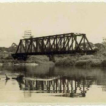Kiri: Jambatan keretapi menyeberangi Sungai Langat, di belakang Arked Mara: “Picture of the old iron railway bridge over the Langat river. … Its location is just behind the Aked Mara building and TNB Kajang along Jalan Reko. This iron-and-wooden bridge has now been replaced with a concrete structure.” (Tanarata International Schools, 2013: Kajang and Its Surrounds, m.s.6).