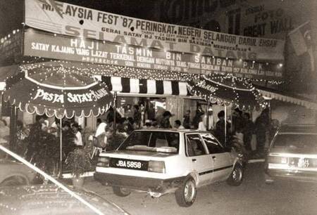 “Kena dengan ayaq tebu pure dia … Masa tu satey Kajang harga RM0.60 saja” - Eusof Mohdroslee (Facebook Bandar Kajang, 28 Oktober 2019: |"KAJANG": Satay Haji Tasmin bin Sakiban, P.J.K., 1987. Gambar warna (colorized) oleh Mohamad Fareez).