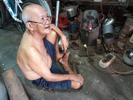 “Tukang Ayan Sin Wah Cheong, a more than 80-year-old tinsmith and metal welding shop owned by Low Woo Ngee, 81, the third generation owner. Low learnt the techniques of smithing from his father when he was just 11. In the old days, charcoal was used for welding and later this was changed to fuel oil. However, due to the rising price of oil, Low has turned to gas. In the 1960s, Kajang town had more than six metal welding shops due to high demand to make rubber-tapping and tin mining tools. Today, the business is declining and Low is struggling to keep afloat.” (Hanna Hussein @ The New Straits Times, December 19, 2019: |"#JOM! GO: More than satay").