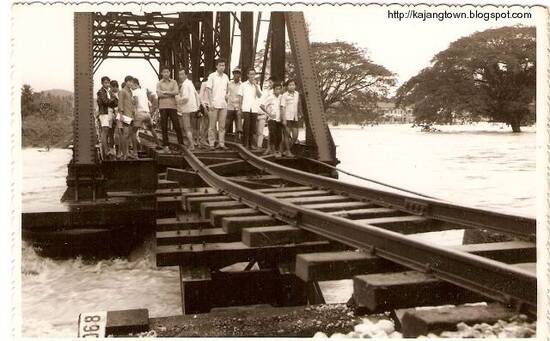 Kanan: Ketika Banjir Besar Kajang 1971 (Y.K.Low, Morgan Soo, 29 April, 2008: |"The Great Kajang Flood 70's"). “The bailey bridge was replaced by reinforced concrete arches over Langat River during construction of second line. Mustaffa Yahaya, or local artist presented the more recent 1980s photo of the station. 1971 flood which was a nationwide disaster then inundated Kajang and the railroad was badly damaged.” (Kajang Heritage Centre乌鲁冷岳社区文物馆, 16 April 2020: "Kajang was linked to Kuala Lumpur in 1896 through railway line built to extend from KL to Seremban").